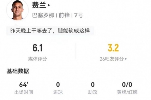 體育資訊1月4日訊 巴薩在本輪西甲對陣西班牙人,費蘭本場數據如下: