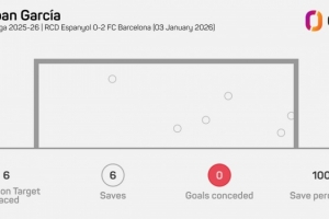 據Opta統計,霍安·加西亞本場比賽做出6次撲救,2023年11月特爾施特根對陣皇家社會之后,他是首位西甲單場6次撲救+零封的巴薩門將。