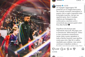 布雷默達(dá)成尤文生涯出戰(zhàn)100場(chǎng)里程碑,他在社交媒體上寫(xiě)道:“能夠身披黑白戰(zhàn)袍出戰(zhàn)100場(chǎng)比賽,我深感自豪。我正在這家俱樂(lè)部經(jīng)歷美妙的時(shí)光,我要感謝整個(gè)尤文大家庭,這對(duì)我意義非凡?!?/p>