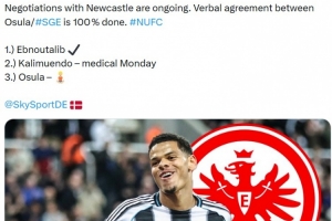 報(bào)道稱由于隊(duì)內(nèi)前鋒布爾卡特(可能缺席至二月底)和巴舒亞伊(三月底復(fù)出)的長(zhǎng)期傷病,法蘭克福正在尋找第三名前鋒,并希望簽下威廉·奧蘇拉。球隊(duì)與紐卡斯?fàn)柕恼勁姓谶M(jìn)行中,奧蘇拉與法蘭克福已經(jīng)達(dá)成了口頭協(xié)議。