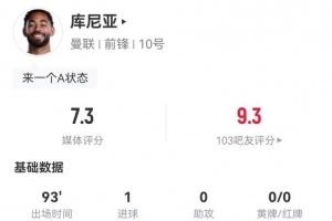 體育資訊1月4日訊 曼聯在本輪英超對陣利茲聯,庫尼亞本場數據如下: