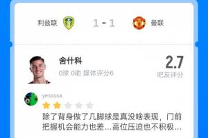 近期舍什科已經遭遇了9場進球荒,本賽季他加盟曼聯后17場比賽僅打入兩球,他的表現也遭到了球迷的口誅筆伐,本場比賽吧友給舍什科打出了2.7的超低分。