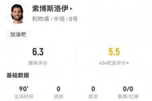 體育資訊1月5日訊 利物浦在本輪英超對陣富勒姆,索博斯洛伊本場客串右邊鋒數(shù)據(jù)如下: