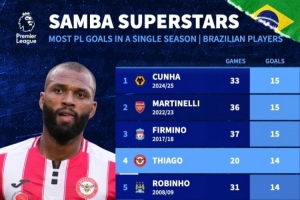英超歷史單賽季巴西射手榜: