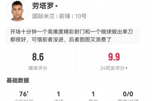 體育資訊1月5日訊 國米在本輪意甲對陣博洛尼亞,勞塔羅本場數據如下: