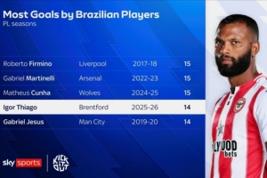 體育資訊1月5日訊 英超第20輪比賽,伊戈爾·蒂亞戈上演帽子戲法,幫助布倫特福德客場4-2擊敗埃弗頓。天空體育指出,伊戈爾·蒂亞戈本賽季英超打進14球,有望打破巴西球員單賽季英超進球紀錄。