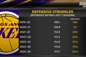 湖人主場迎戰灰熊,賽前轉播方給出了湖人過去7個賽季的防守效率排名。