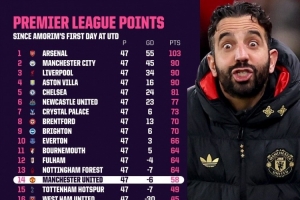 阿莫林執(zhí)教曼聯(lián)以來英超積分排名: