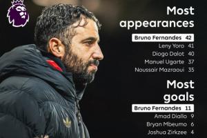 體育資訊01月05日訊 在阿莫林下課后,英超官方曬出了阿莫林執(zhí)教期間,曼聯(lián)球員的各項(xiàng)數(shù)據(jù),B費(fèi)在出場數(shù)、進(jìn)球數(shù)、助攻數(shù)上都是最多的。