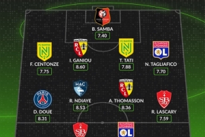 中場:杜埃(巴黎,8.31分)、拉索爾·恩迪亞耶(勒阿弗爾,8.53分)、阿德里安·托馬森(朗斯,8.36分)、雷米·拉博·拉斯卡里(布雷斯特,7.59分)