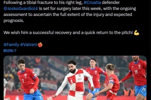 體育資訊1月6日訊 在格瓦迪奧爾遭遇右腿脛骨骨折并將接受手術(shù)后,克羅地亞足協(xié)為他送上了祝福。