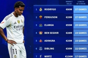 體育資訊11月8日訊 德轉盤點了目前遭遇進球荒的攻擊手,其中羅德里戈27連續27場進球荒居首,以下為具體情況(只統計身價2500萬歐以上球員):
