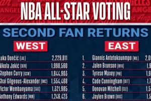 體育資訊1月7日訊 2026年NBA全明星球迷投票首輪結果出爐,東契奇領跑全聯盟(票王),字母哥東部第1,約基奇、布倫森和馬克西分列得票總排名前5,庫里西部第3,詹姆斯升至西部第8。