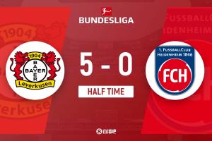 體育資訊11月08日訊 勒沃庫森半場5-0領先海登海姆,對手被迫33分鐘連換兩人。