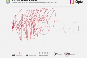 據(jù)Opta統(tǒng)計,林德洛夫本場比賽傳球85次,成功率100%。2022年2月26日拉波爾特(110次傳球全部成功)之后,林德洛夫是英超單場傳球次數(shù)最多且成功率100%的球員。