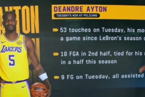 據統計,在這場比賽中,艾頓全場觸球53次,創下自詹姆斯賽季首秀以來的單場最高紀錄。