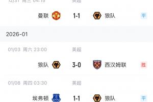 體育資訊01月08日訊 英超第21輪,狼隊客場1-1戰平埃弗頓,英超副班長近3輪保持不敗,連拿5分!