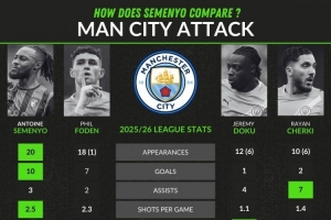 體育資訊1月8日訊 根據多家媒體的報道,伯恩茅斯邊鋒塞梅尼奧將加盟曼城,WhoScored統計了塞梅尼奧與幾位曼城攻擊手本賽季的英超數據。