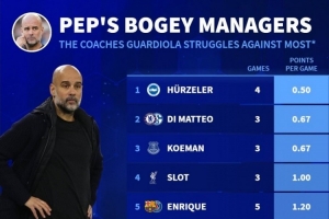 體育資訊1月8日訊 德國轉會市場統計了瓜迪奧拉對陣不同教練的場均積分,并列出瓜帥克星榜單,赫爾澤勒居首,斯洛特、克洛普、阿莫林在列。