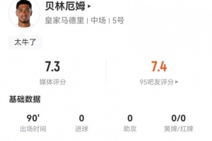 體育資訊1月9日訊 皇馬在本輪西超杯對陣馬競,貝林厄姆本場數據如下: