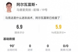 體育資訊1月9日訊 馬競在本輪西超杯對陣皇馬,阿爾瓦雷斯本場數據如下: