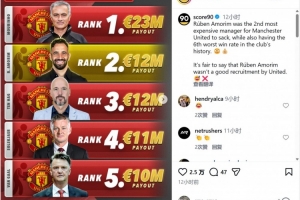 體育資訊1月9日訊 score90的社媒賬號,給出曼聯(lián)過去幾年解雇主帥的花費排行,其中穆里尼奧以2300萬歐列第一。