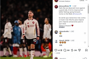 麥卡利斯特社媒曬出比賽照片,并寫道:“對陣一支優(yōu)秀的球隊,感覺我們配得上更好的結(jié)果。仍有很多需要改進之處,但對未來的感覺更好了,加油紅軍!”