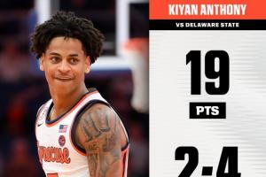 此役,卡梅隆·安東尼之子、雪城大學后衛基揚·安東尼迎來大學生涯第一次首發,他表現十分高效,全場上陣29分鐘11投8中,三分4中2、罰球4中1,砍下19分3籃板4助攻1搶斷,沒有失誤。