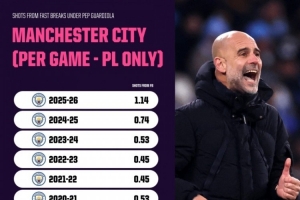 瓜迪奧拉執教曼城英超場均快速反擊射門次數: