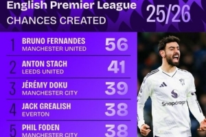 體育資訊1月9日訊 數(shù)據(jù)機(jī)構(gòu)squawka統(tǒng)計了本賽季英超創(chuàng)造機(jī)會榜,曼聯(lián)隊長B費斷崖領(lǐng)跑。