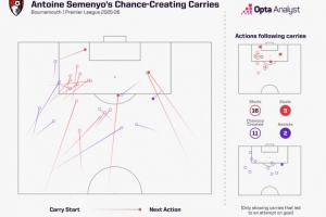 據(jù)Opta統(tǒng)計,塞梅尼奧本賽季英超帶球射門16次、創(chuàng)造11次機會,帶球后打進3球、助攻2次,展現(xiàn)了不俗的突擊能力。