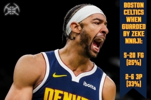 掘金官方今日曬出了一組數據,昨天凱爾特人球員面對納吉防守時,運動戰20中5,三分6中2。