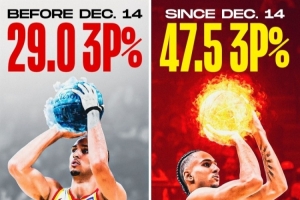 據統計,在賽季開始至北京時間12月15日這段時間,他的三分命中率僅為29%。而在那之后的12月16日至今,他的三分命中率達到47.5%。