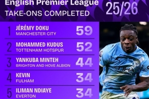 體育資訊1月10日訊 squawka統計了本賽季英超成功過人情況,多庫力壓庫杜斯居首。