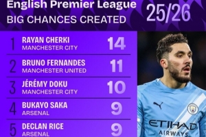 本賽季英超創(chuàng)造重大機會榜: