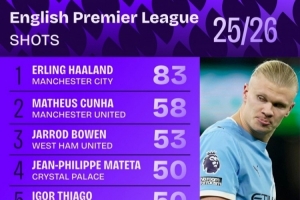 體育資訊1月10日訊 Squawka統計了本賽季球員在英超的射門次數,并列出榜單,哈蘭德83次斷層居首。