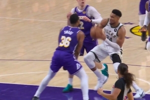 GIF-字母哥撞倒斯瑪特上籃2+1,湖人挑戰(zhàn)成功,變字母進(jìn)攻犯規(guī)