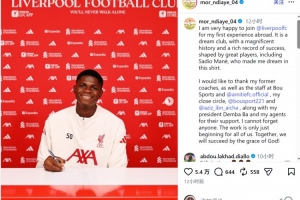 恩迪亞耶寫道:“我非常高興能加入利物浦俱樂部,開啟我首次海外效力經歷。這是一家夢想中的俱樂部,擁有輝煌的歷史和豐厚的成功底蘊,由眾多偉大球員塑造而成,其中包括馬內,正是他讓我懷揣穿上這身球衣的夢想。