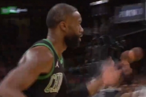 GIF-杰倫·布朗迎著文班亞馬調高弧頂命中三分
