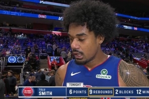 上半場,活塞雙向合同球員托盧·史密斯表現出色,籃板已經刷新生涯新高(此前7個),替補出戰12分鐘,投籃4中1,罰球4中4,拿到6分9籃板(4前場籃板)2搶斷2蓋帽的數據。