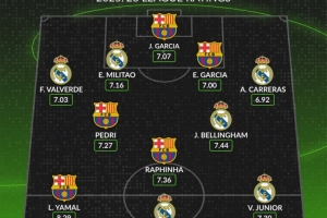 體育資訊1月11日訊 皇馬和巴薩將在本輪西超杯狹路相逢,whoscored也統(tǒng)計了兩隊本賽季西甲評分合體最佳陣,亞馬爾、姆巴佩領銜。
