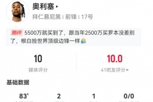 體育資訊1月12日訊 拜仁在本輪德甲7-1領先狼堡,奧利塞本場數據如下: