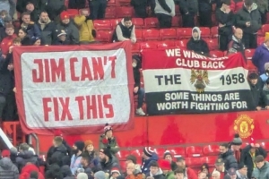 現(xiàn)場的曼聯(lián)球迷打出了兩面橫幅,其一是“吉米(拉特克利夫的名字)解決不了這個”,另一面橫幅則寫著“我們想要回我們的俱樂部。1958。有些事是值得為之奮戰(zhàn)的。”