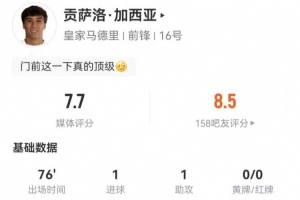 體育資訊1月12日訊 皇馬在本輪西超杯對陣巴薩,貢薩洛·加西亞本場數(shù)據(jù)如下: