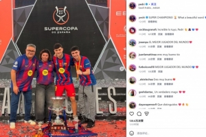 兩人也都在賽后通過社媒曬出捧杯照。佩德里配文道:“超級杯冠軍??多么美麗的詞匯????”。