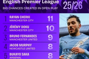 本賽季英超運動戰創造重大機會榜: