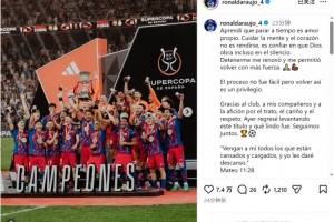 體育資訊1月13日訊 巴薩后衛阿勞霍更新社媒動態,談到了復出并隨隊贏得西超杯的感受。