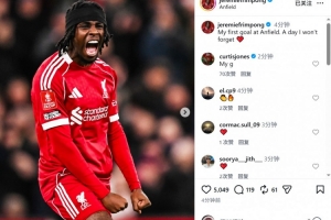 弗林蓬社媒曬出慶祝進球的照片,配文:“我在安菲爾德的首粒進球,我永遠不會忘記的一天。”