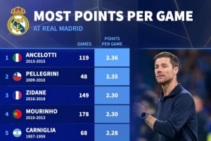 體育資訊1月13日訊 皇馬官方宣布主帥阿隆索下課,德國轉會市場統計了皇馬主帥的場均積分,阿隆索2.24分排名第7位。