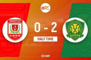 傷停補時7分鐘。上半場比賽結束,長春亞泰0-2北京國安。